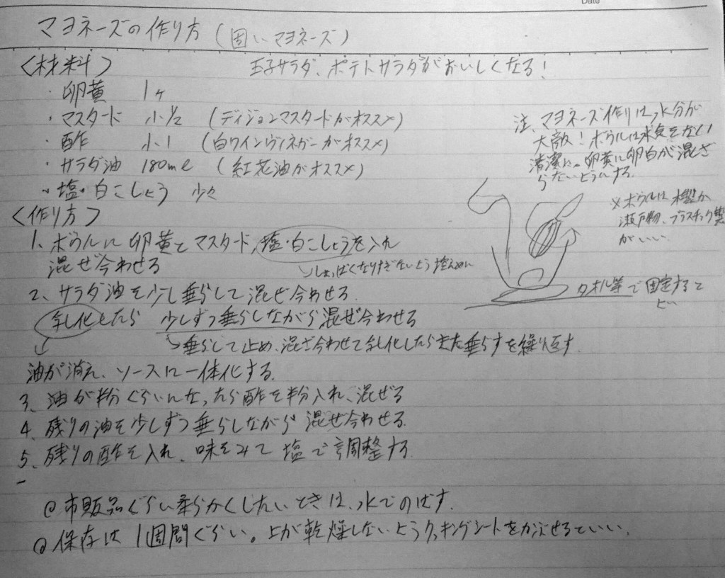 同じ班のメンバーが包丁を使いテキパキと作業を開始し、僕はたまごサラダに使うマヨネーズを作る担当になりました。
